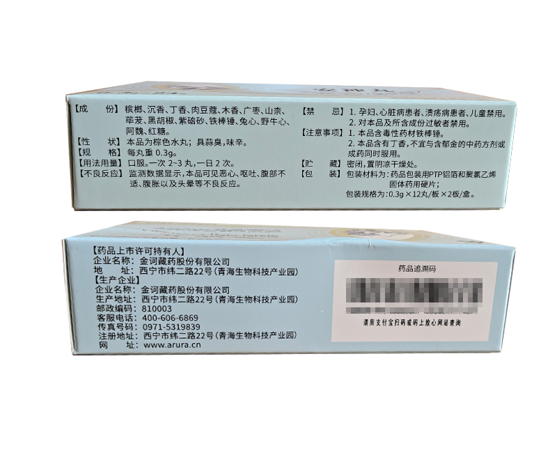主要成份:槟榔、沉香、丁香、肉豆蔻、木香、广枣、山柰、荜茇、黑胡椒、紫硇砂、铁棒锤、兔心、野牛心、阿魏、红糖。